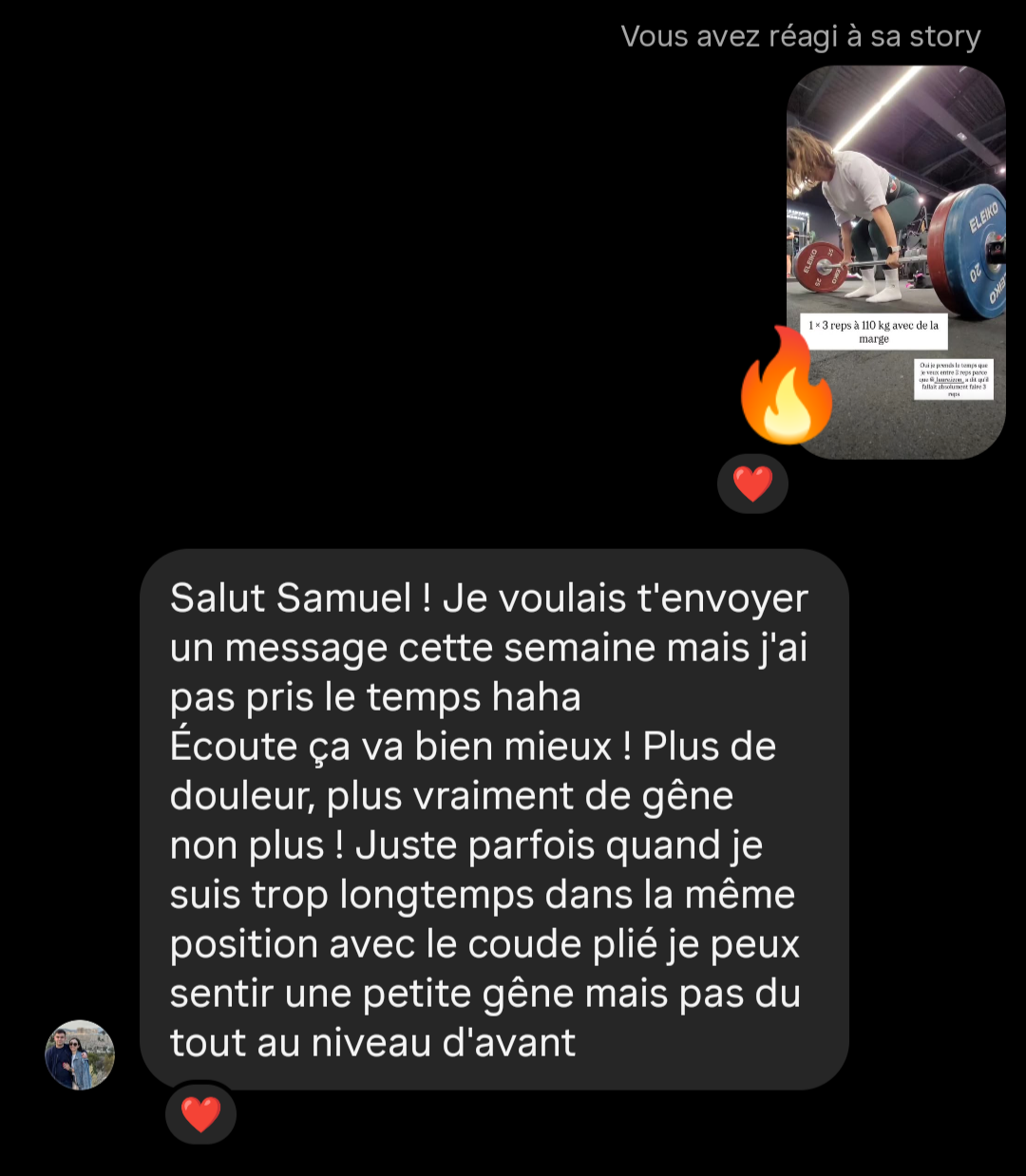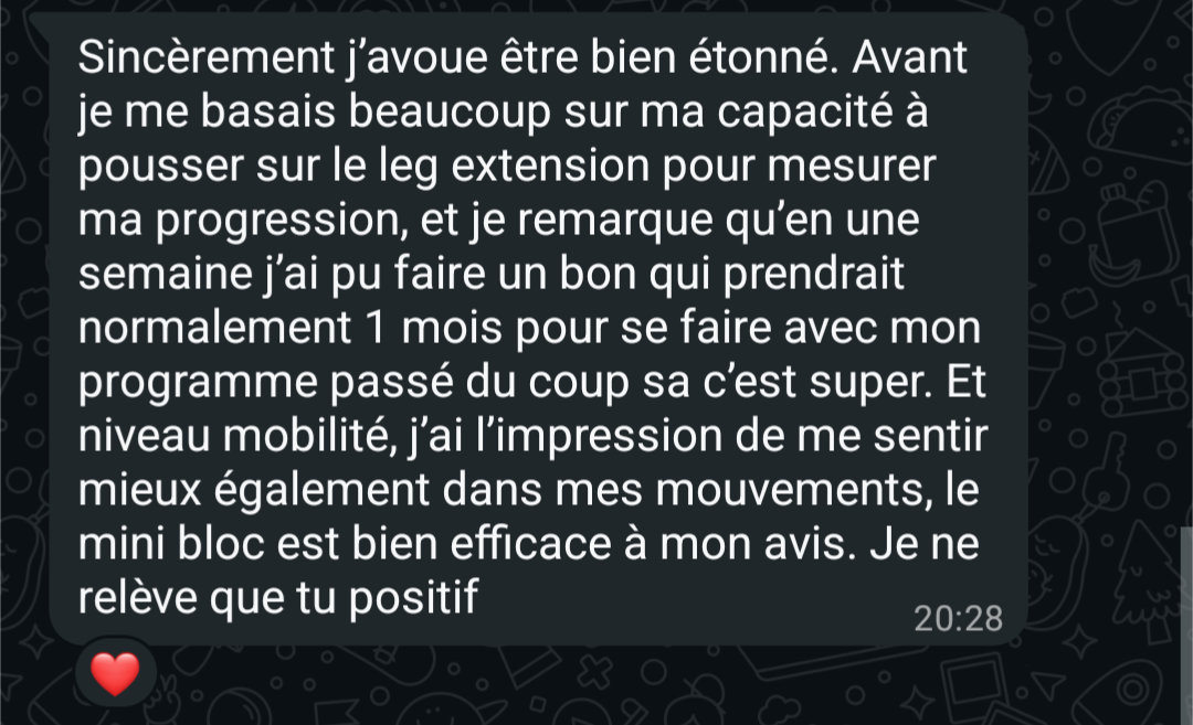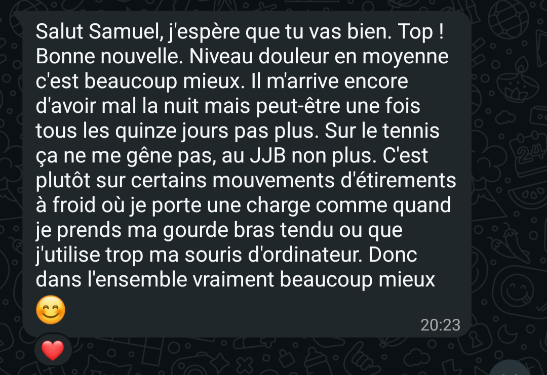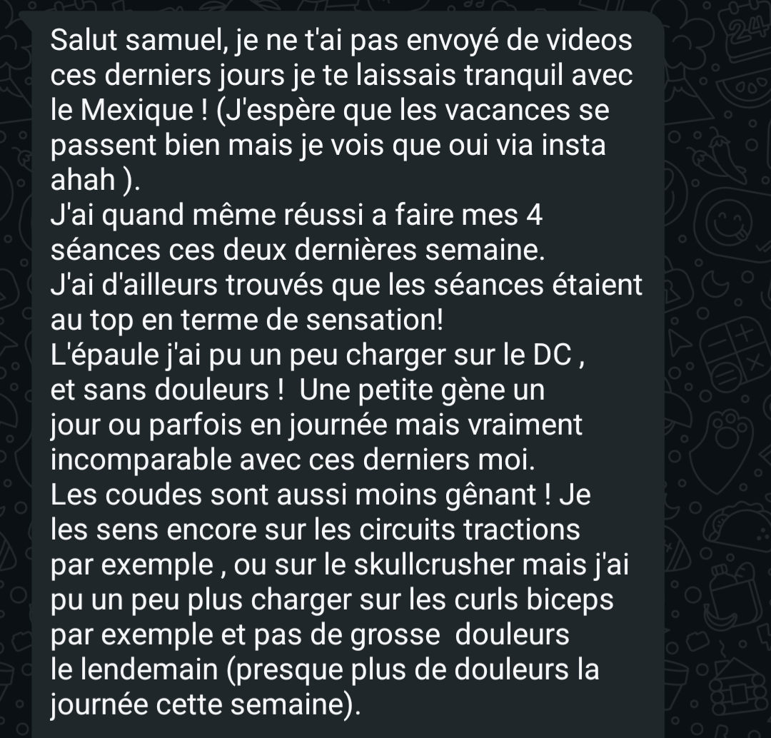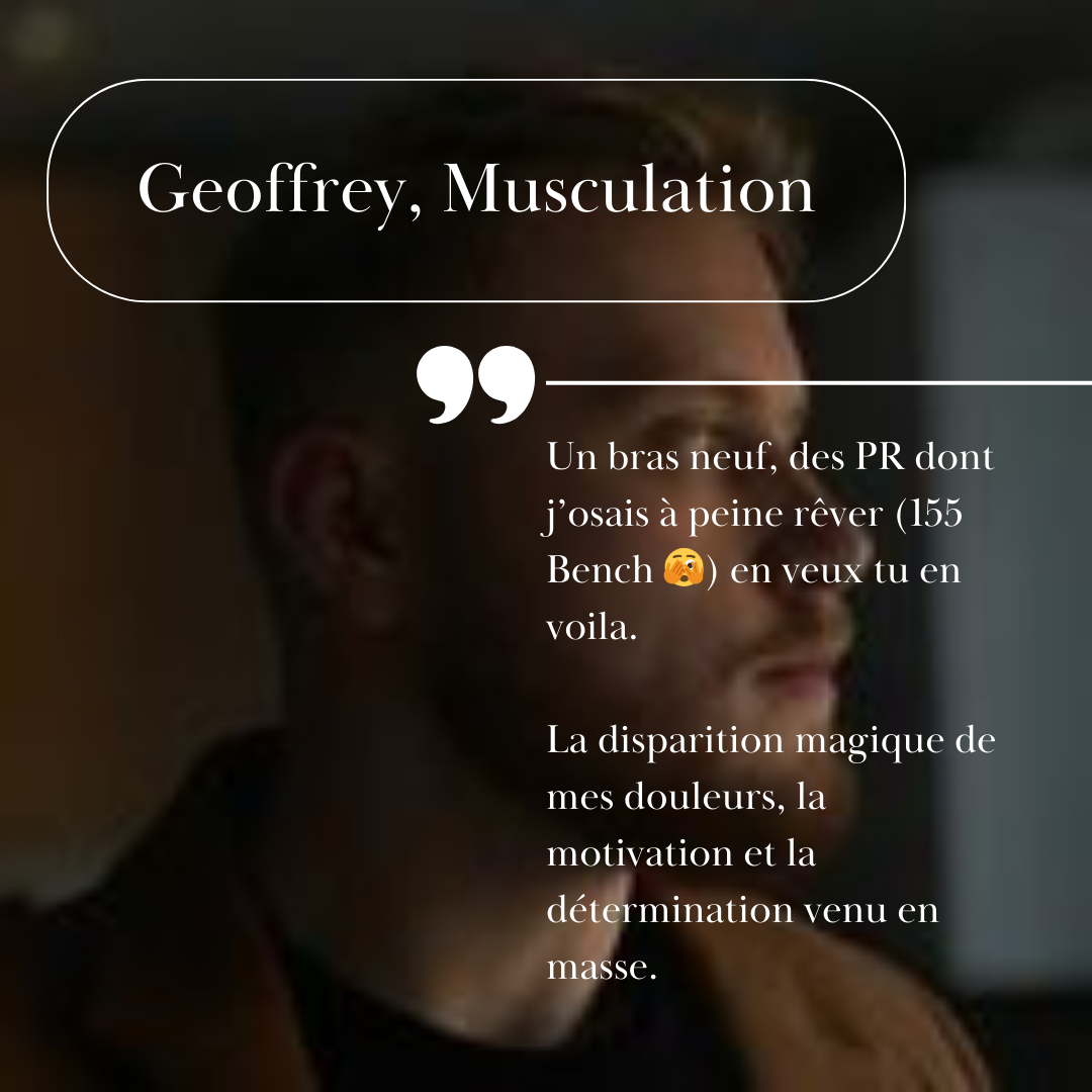 "Un bras neuf, des PR dont je n'osais à peine réver (155kg bench) en veux tu , en voilà."